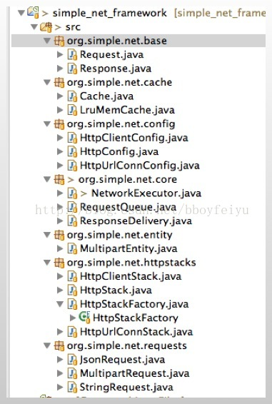 SimpleNet框架的基本结构类似于Volley,包括一些命名上也有跟Volley一致。它主要分为四个部分,最上面的部分为Request,即各种请求类型。例如返回的数据类型为json的对应为JsonRequest,返回数据字符串的为StringRequest,如果需要上传文件,那么你需要使用MultipartRequest,该请求只支持小文件的上传,如果上传的文件过大则会产生OOM。
