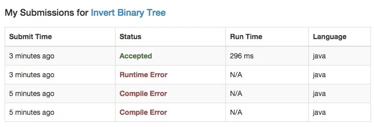 编译错了两次,之后运行错了一次,出现了 NullPointerException,于是想到没有检查指针为空,加上检查之后,就通过了。下图是提交记录。