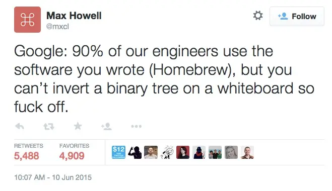Google: 90% of our engineers use the software you wrote (Homebrew), but you can’t invert a binary tree on a whiteboard so fuck off.