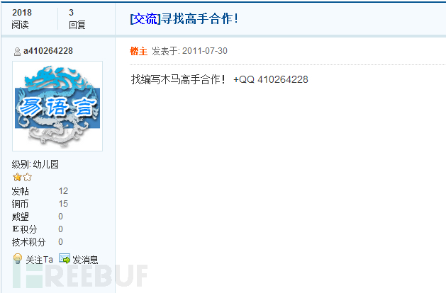 作者的百度知道:www.baidu.com/p/410264228…,木马作者发的易语言帖子,2011年就开始找写木马的高手了。 bbs.eyuyan.com/u.php?uid=3…