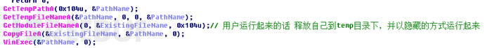但是他们不知道其实木马还没结束,它会把自身复制到临时目录下,然后通过WinExec这个API,传递第二个参数是SW_HIDE把自身重新运行起来,如图: