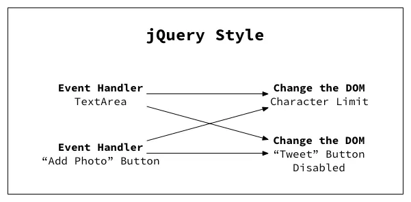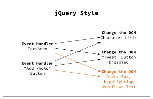If we were to implement this in jQuery, our code will be even messier. Notice in the diagram that we'll be adding two more arrows for one new feature.