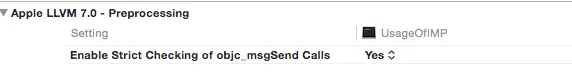 这种情况下IMP被定义为无参数无返回值的函数。所以你需要到工程里搜索到这个选项并把它关闭。这样的麻烦就是,每次使用,你都需要修改工程配置,所以这里我再介绍另外一种办法:重新定义一个和有参数的IMP指针相同的指针类型,在获取IMP时把它强转为此类型。这样运用IMP指针后,就不需要额外的给ViewController写新的方法: