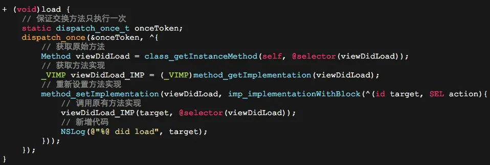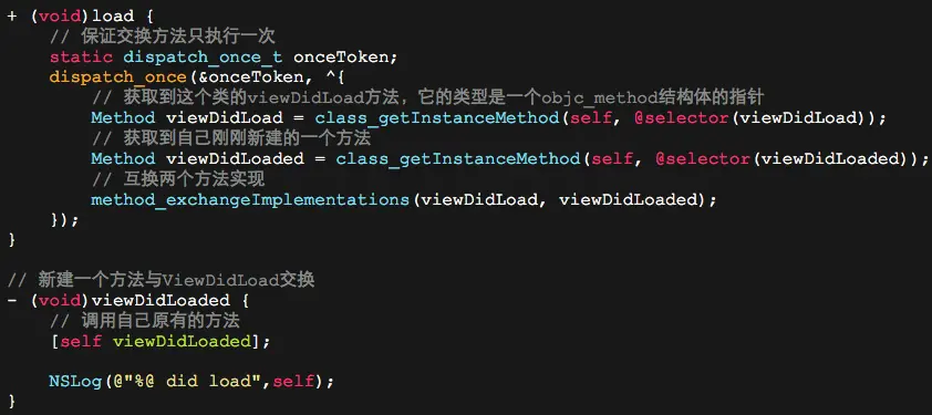 它通常叫做method swizzling,算是ObjC的"黑魔法"了,作用就是在程序运行期间动态的给两个方法互换实现,比如有这样一种使用场景: