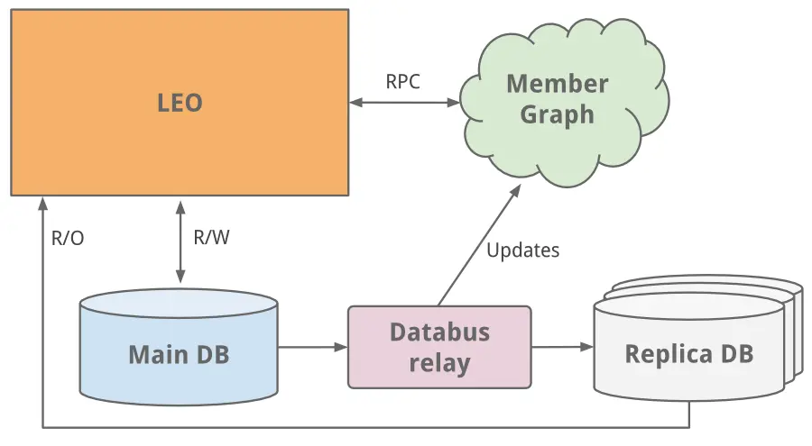 随着站点的增长, Leo系统也在扩大, 增加了更多的角色和职能, 也更加的复杂。 通过负载均衡可以运行多个Leo实例,但是新增的负载也影响到LinkedIn的最关键系统-会员信息数据库。