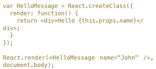现在,以var开头的第一段里我们定义了一个叫HelloMessage的组件;下面的React.render这一行所做的,则是把这个组件渲染到document.body里——也就是我们实际的页面上。但在使用〈HelloMessage/〉的时候,我们做了另一件事:name="John"。看起来很像HTML中的元素属性,但是既然JSX不是HTML,这个语法的作用是什么呢?实际上,这就是我们向React组件传入props的方式。回头看第一段,我们可以看到在组件的内部有对this.props.name的引用。这个name就是我们刚刚指定的John!