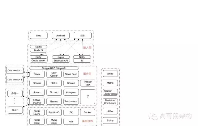 作为一个典型的移动互联网创业公司,雪球的总体架构也是非常典型的设计: