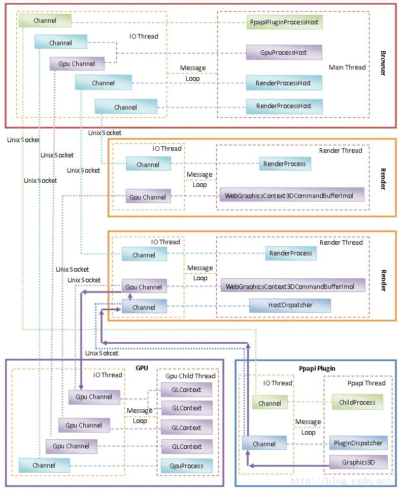 当一个进程的主线程执行某个操作需要与另一个进程进行通信时,它的主线程就会将一个消息发送到IO线程的消息循环去。IO线程在处理这个消息的时候,就会通过前面已经创建好的UNIX Socket转发给目标进程处理。目标进程在其IO线程接收到消息之后,一般也会通过其主线程的消息循环通知主线程执行相应的操作。这就是说,在Chromium里面,线程间通过消息循环进行通信,而进程间通过UNIX Socket进行通信的。