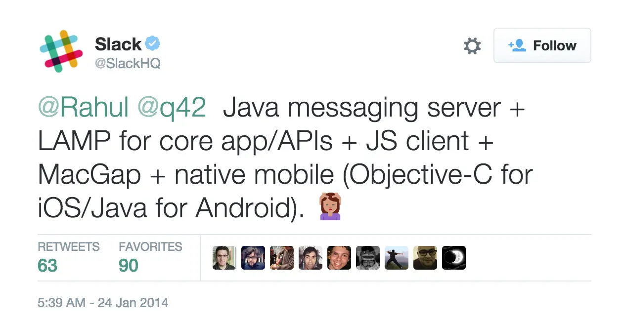 Slack 团队在 twitter 上公开他们使用的技术栈,用 Java 来写消息服务器,后端用的是 LAMP 架构,浏览器是 JavaScript,Mac 端是 MacGap,移动端都是原生应用(iOS 用 Objective-C,Android 用 Java)[冷知识] Slack 的后台架构是 LAMP,用 Java 写消息服务