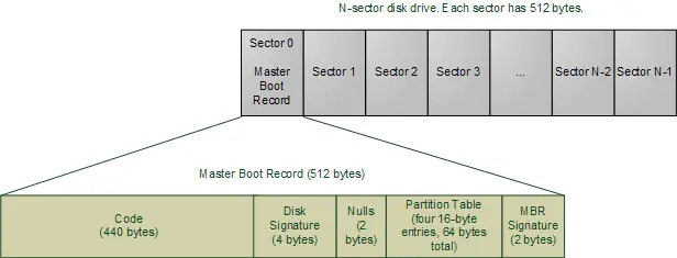 - BIOS根据指定的顺序,检查引导设备的第一个扇区(即主引导记录),加载在内存地址 0x7C00