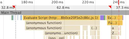 A millisecond or two after this occurs, you'll see the big yellow "Evaluate Script" bars start up. You'll notice the flamegraph start to get a lot deeper here. It's hard to tell on this site as to what's going on because the Javascript has been minified, but in development mode, pre-minified, you can learn a lot about why it takes so long for your Javascript to evaluate here.