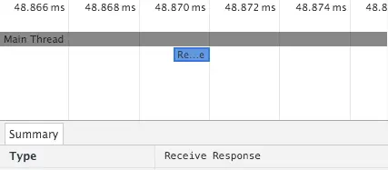 You may also see two "Send Request" events (they're really small) beneath the "Parse HTML" event. In case you haven't figured it out already, what we're looking at is called a "flamegraph". Events underneath other ones mean that the upper event "called" the lower one. The two "Send Request" events you see here are the browser requesting the Javascript and CSS files linked in the head. This is a Rails app, so there's only one of each.