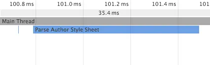 It's generally at this point that you'll see the blue bar in Timeline - this is the DomContentLoaded event. At this point, your browser is done parsing the HTML and running any blocking Javascript (that is, Javascript either embedded in the page or in a script tag that isn't marked async). Most browsers have not painted anything to the screen by this point.