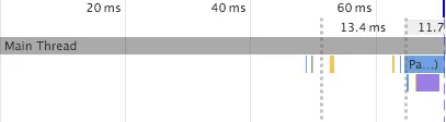 As we move along the timeline to the right, you should start seeing some green bars in the flamegraph. These are Paint related events. There's a whole lot that can go on in these events (and Chrome even provides profiling tools just for these painting events), but I'm not going to go too deep on them here. All you need to know is that paint events happen when the browser is done rendering (the purple bars - the process of turning your CSS and HTML into a layout) and needs to turn the layout into pixels on a screen.