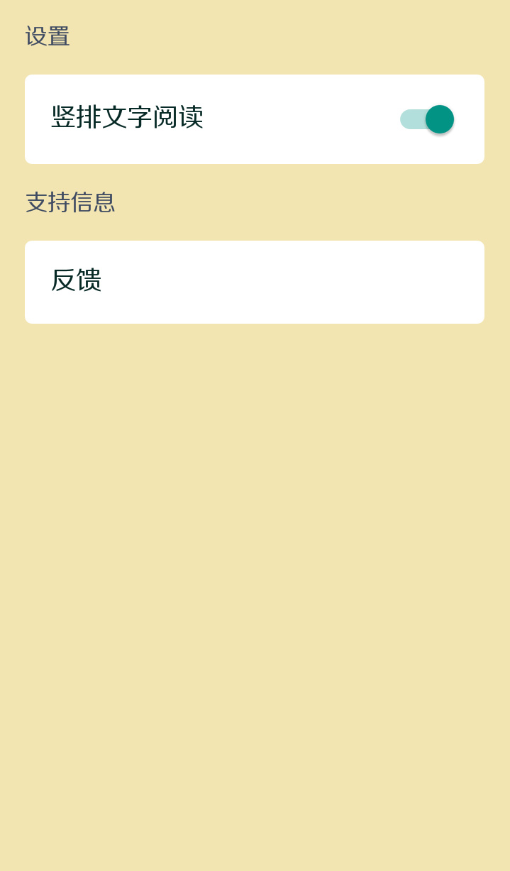 当然,上面有点粗糙,而且不支持竖排文字,这是原版设计风格的一大缺失,所以本人在改进版中支持用户选择竖排浏览方式,而且作为一款新产品,获取用户的反馈是极为重要的,故也添加反馈入口(由于没搭后台,只能先让用户以邮件形式反馈😭)。
