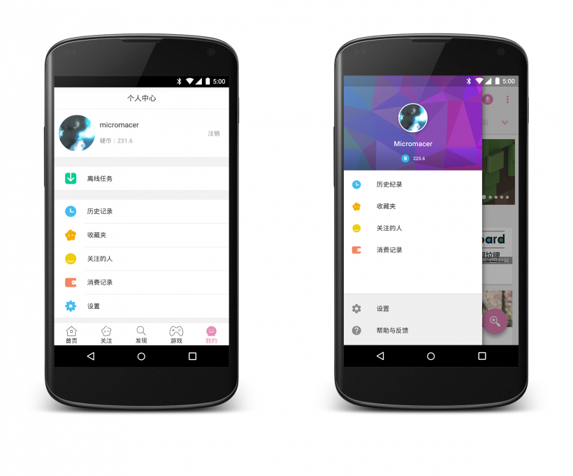 之前的 v3.3.0 及更早的版本将个人信息放在最左边的 Tab ,而最新的 v4.0.0 将个人信息放在“我的” Tab。个人认为这个区域完全可以用 Drawer 替代。