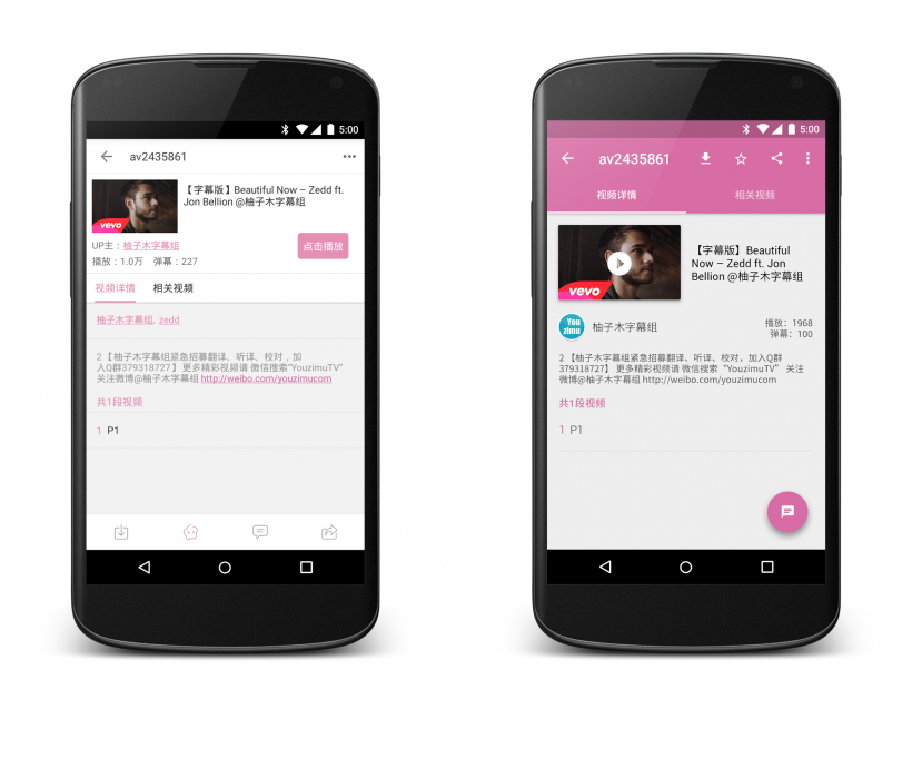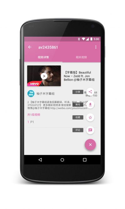 首先当然是采用了“正常”的 App Bar——原来播放界面的 App Bar 高度并不标准。其次在这个界面我使用了不同的配色方案——以标志性的粉色作为底色,字体和图标以白色呈现。同时将“点击播放”按钮去掉,变成点击封面图即可播放,封面图也进行了适当地放大。最后将原先在视频信息下的 Tab 转移到上面,所以一共做的改动有: