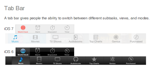 首先要纠正一个用词错误:用于切换不同页面的 Bar 叫 Tab Bar,而不是 Tools Bar.这点在 Apple 官方的 iOS 7 UI Transition Guide 中也有提到。