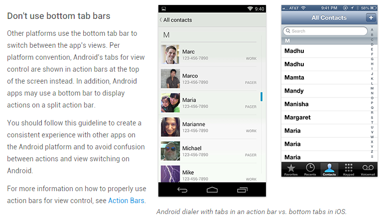 Google 很早就谈到了这一点:Pure Android 页面中列出了很多“不该做”的事情,其中之一就是“不要使用底部 Tab Bars”。
