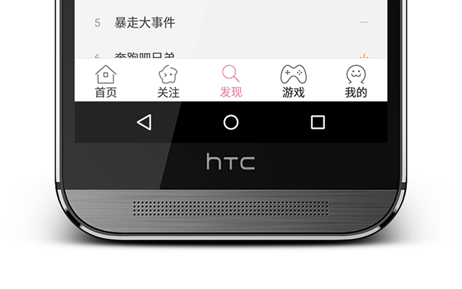 v4.0.0 加入了“关注”、“发现”和“游戏”三个 Tab 项目。按道理来说,一个放在 App Bar 上的搜索即可解决问题,但是考虑到“游戏”等项目的特殊属性需要足够的曝光度等,最终决定将这三项合并为一个 “发现” Floating Action Button.