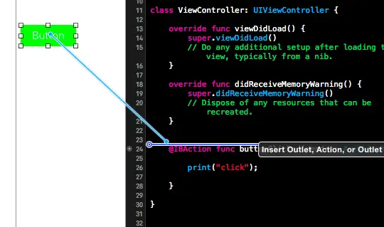 随后,我们按住 Option 键,然后点击 ViewController.swift 文件,可以在设计界面旁边打开辅助界面。打开后,我们按住 Control 键,然后将我们刚刚创建的按钮拖动到代码视图中: