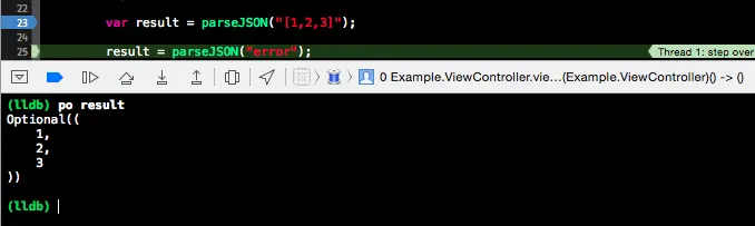 我们这里对 result 变量进行了判断,并进行了分别的输出。下面我们以让将断点设置到第一个语句上,然后运行程序。再断点处我们用 po 命令来打印出 result 的值。
