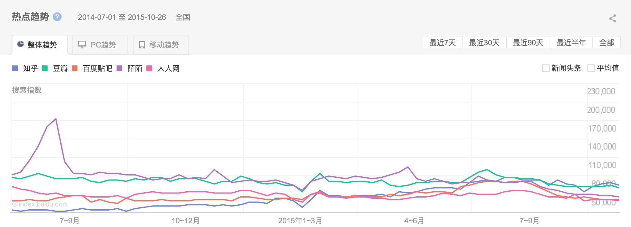 从百度指数上看,过去一年里知乎的影响力一直在攀升,如今已经超过几亿用户的豆瓣、百度贴吧、陌陌等互联网产品。