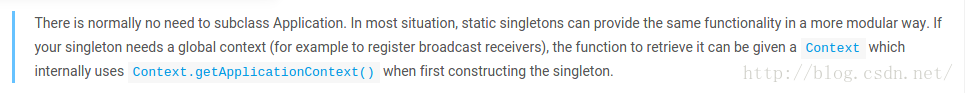 }以上是我们平时在使用Application时需要注意的一个点,下面再来介绍另外一种非常普遍的Application误用情况。其实Android官方并不太推荐我们使用自定义的Application,基本上只有需要做一些全局初始化的时候可能才需要用到自定义Application,官方文档描述如下: