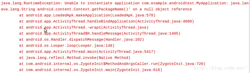 }这是一个非常简单的自定义Application,我们在MyApplication的构造方法当中获取了当前应用程序的包名,并打印出来。获取包名使用了getPackageName()方法,这个方法就是由Context提供的。那么上面的代码能正常运行吗?跑一下就知道了,你将会看到如下所示的结果:应用程序一启动就立刻崩溃了,报的是一个空指针异常。看起来好像挺简单的一段代码,怎么就会成空指针了呢?但是如果你尝试把代码改成下面的写法,就会发现一切正常了: