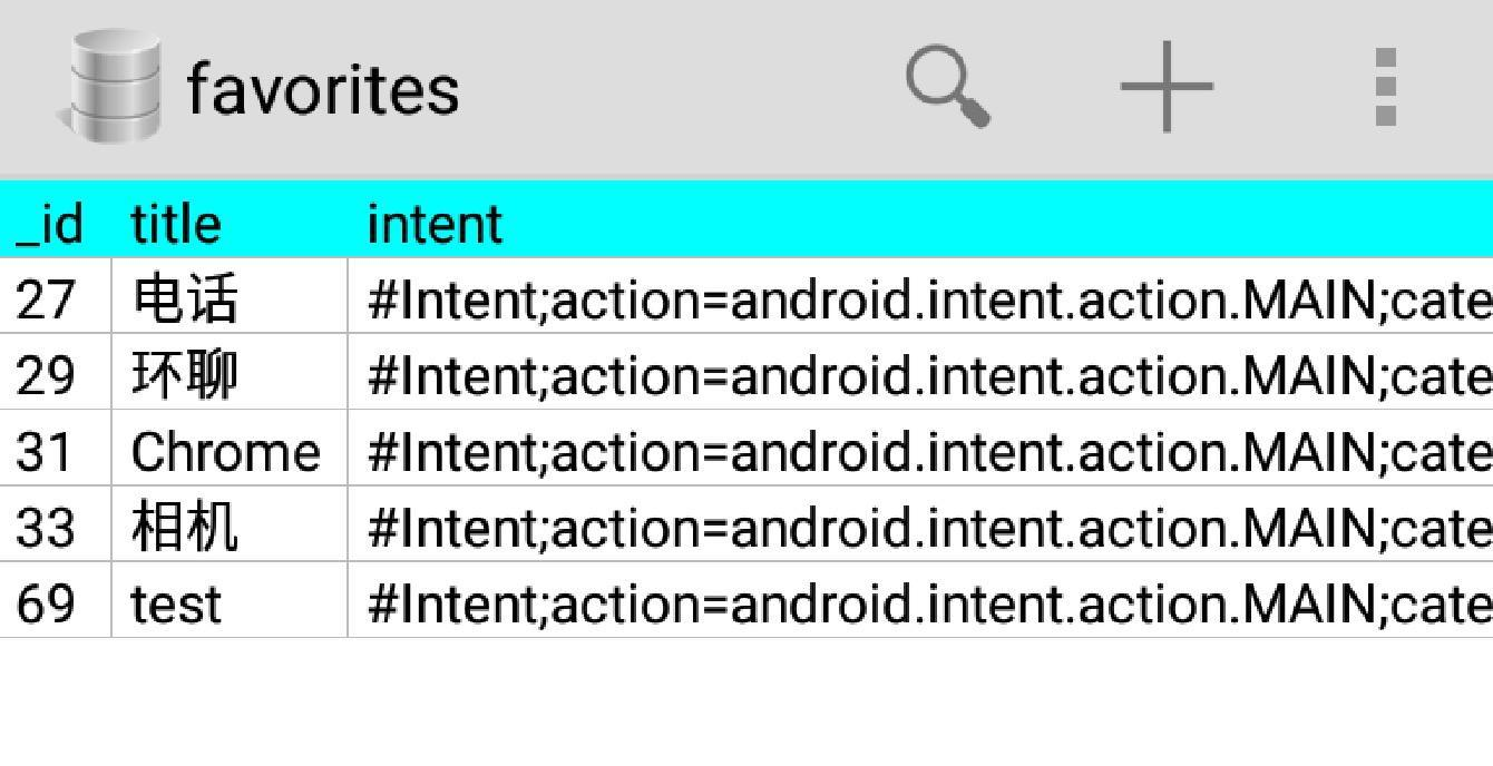 我们打开Launcher.db的favorite表,这里就是我们保存的快捷方式数据: