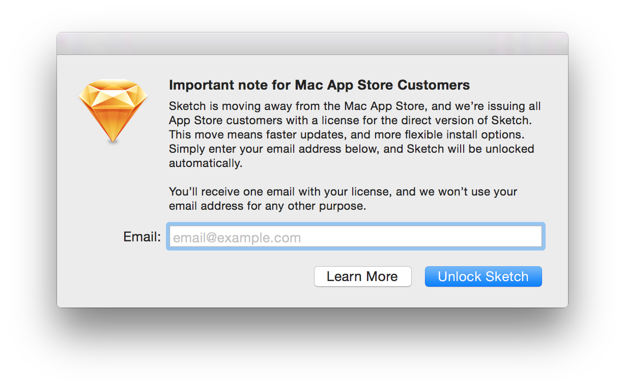 Today, we’re announcing an important change in how you receive updates to Sketch. After much thought, and with a heavy heart, we’re moving Sketch away from the Mac App Store. If you’re a Mac App Store customer, all you need to do is download Sketch from our website, launch it and enter your email address to receive your license.