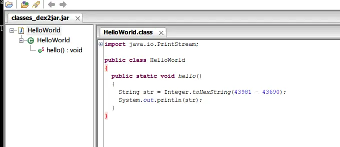 运行后在SD卡的dexmaker目录下找到刚创建的文件“Generated1532509318.jar”,把里面的“classes.dex”解压出来,然后再用“dex2jar”工具转化成jar文件,最后再用“jd-gui”工具反编译jar的源码。