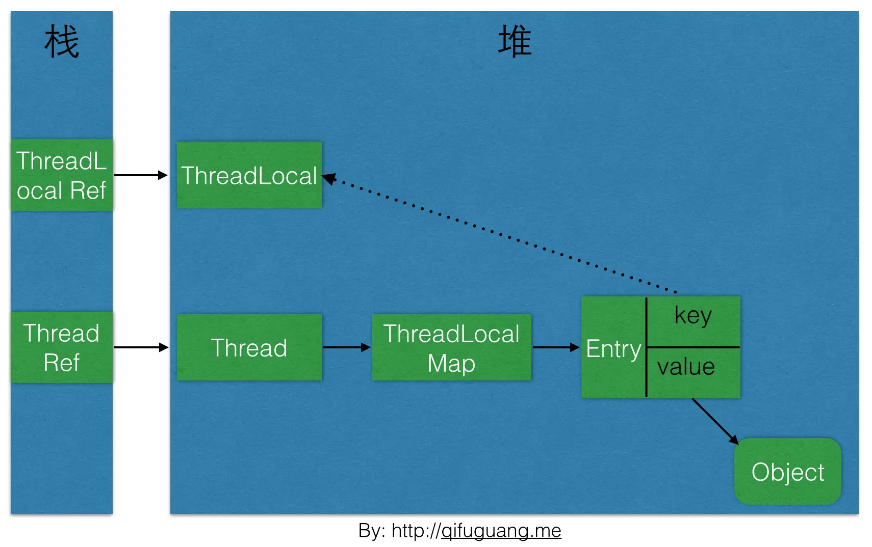 Thread Ref -> Thread -> ThreaLocalMap -> Entry -> value