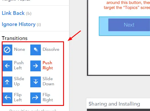 添加好跳转之后,再选择您需要的转场效果,flinto提供了最常用的几种方式:淡入,左侧滑入,右侧滑入,向上弹出,向下收起,左边翻转,右边翻转。虽然方式简单,但是都极为流畅。