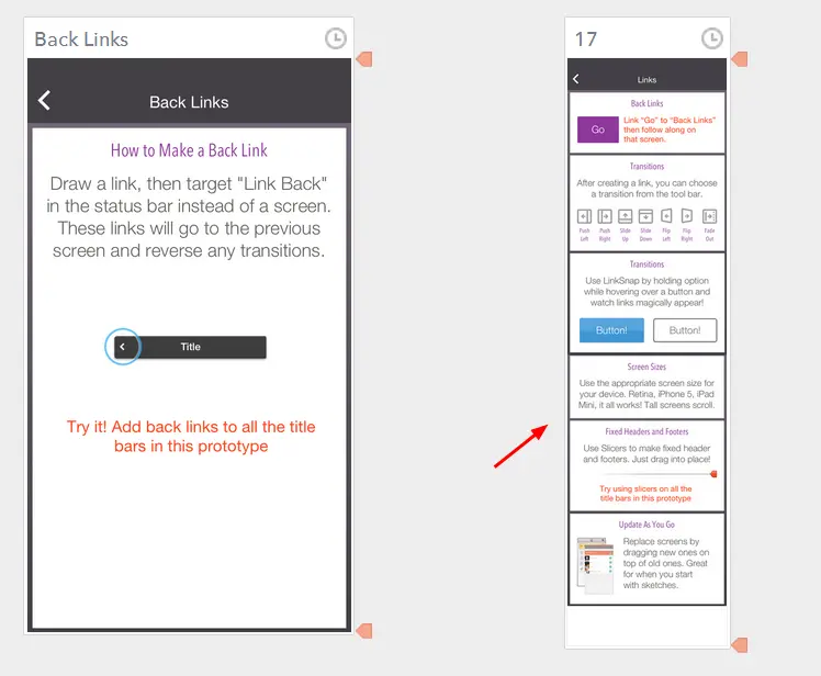 在原型中,返回是使用场景做多的跳转,flinto提供linkback 的操作 ,框出您要返回的区域,点击linkback即可。