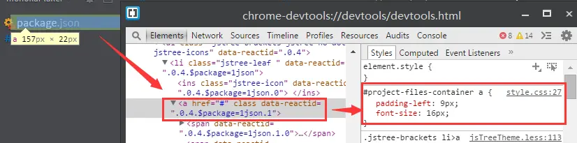 通过开发者工具,找到定义文件树的标签和样式定义,可以看到是在style.css文件里的#project-files-container a (注意,我安装的文件树的插件,所以和你所找到的会不一样):