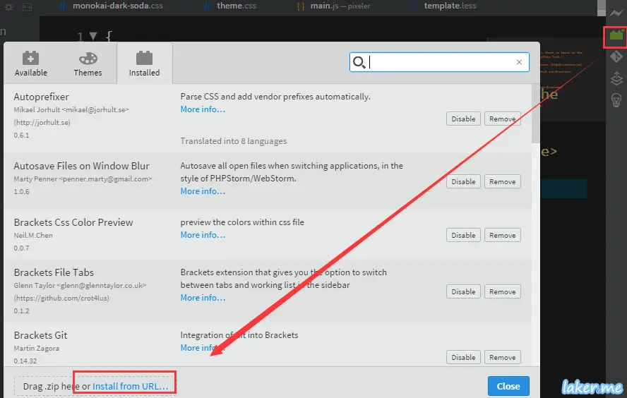 在网上找的你喜欢的主题,我用的是一个基于 Sublime Monokai 的主题。GIthub 的地址是 https://github.com/Brackets-Themes/Monokai。