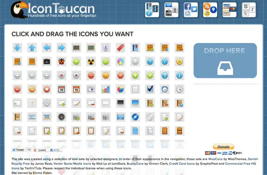 IconToucan:是一个分享免费图标素材的站点,设计师可以任意下载并使用,网站可以快速查看透明的PNG图标,然后拖拽到页面的右边抽屉里。在下方的列表里面是供你选择的图标,通过单击你可以下载所有的免费图标的ZIP压缩包。