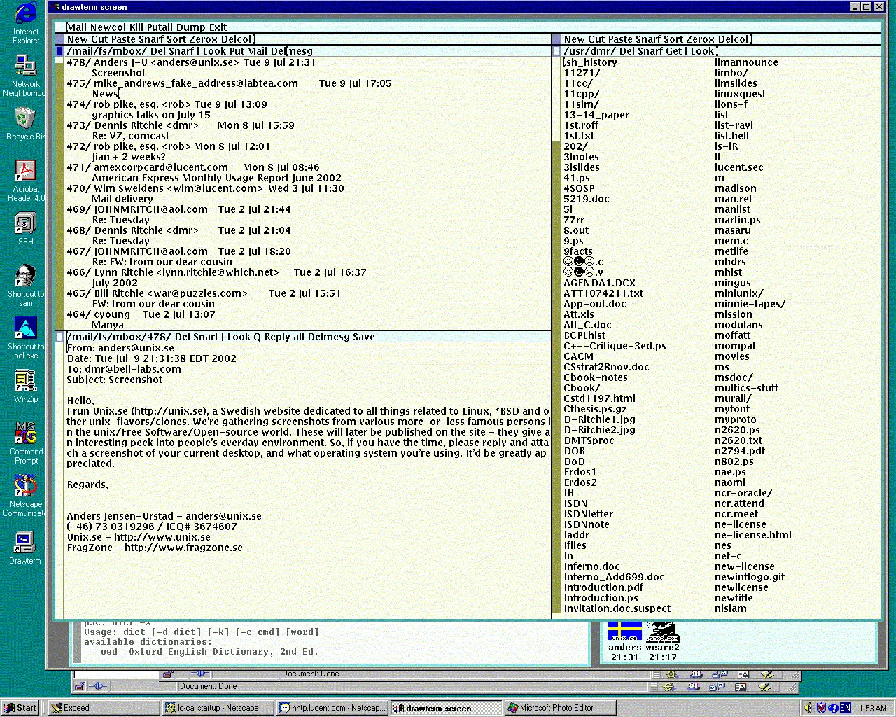 2002年,我在Unix.se上发起了向Unix / 开源人士搜集电脑桌面截屏的活动,搜集的目标是随机的。自然,Dennis Ritchie就是其中之一。这是他发给我的他的电脑截屏,时间是2002年6月9日。