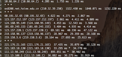 通过对于路由器IP的分析,我们可以发现第一跳通过我们的局域网路由,然后通过杭州教育网,然后杭州联通,到北京联通,之后再到北京移动,最后结束。
