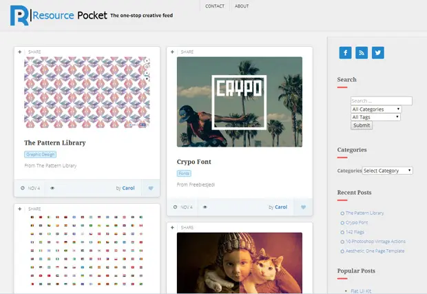 Resource Pocket:每天都会更新干货的网站 关关_关关 2015-12-16 569 阅读1分钟 原文链接: hao.jobbole.com 这是一个每天都会更新干货的网站,从免费素材到代码片段,从教程到设计文章一应俱全。 官方网站:www.resourcepocket.net/