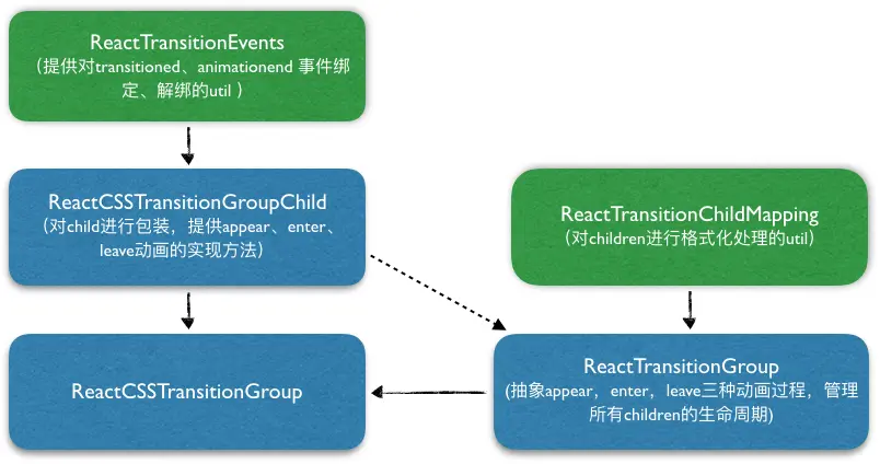 ReactCSSTransitionGroup 的源码分为5个模块,我们先看看这5个模块之间的关系: