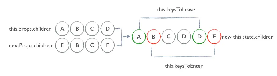 当接收到新的 props 后,先将 nextProps.children 和 this.props.children 合并,然后转化为对象,并更新到 this.state.children。计算在 nextProps 中即将 leave 的 child,如果该元素当前没有正在运行的动画,将该元素的 key 保存在 keysToLeave。