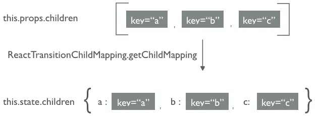 this.props.children转化为对象,其中对象的 key 就是 component key,这个 key 与 children 中的元素一一对应,然后将该对象设置为 this.state.children;