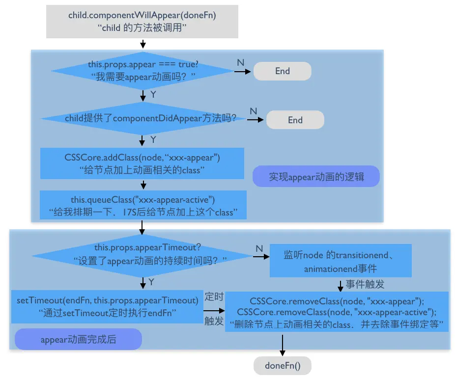 下面来看 ReactCSSTransitionGroupChild 是怎么实现节点的动画的。以 appear 动画为例,在 child.componentWillAppear 被调用的时候,给该节点加上 xxx-appear 的 className ,并且在一帧(React 里是写死的17s)后,给该节点加上 xxx-appear-active 的 className ,最后在动画结束后删除 xxx-appear 以及 xxx-appear-active 的 className。