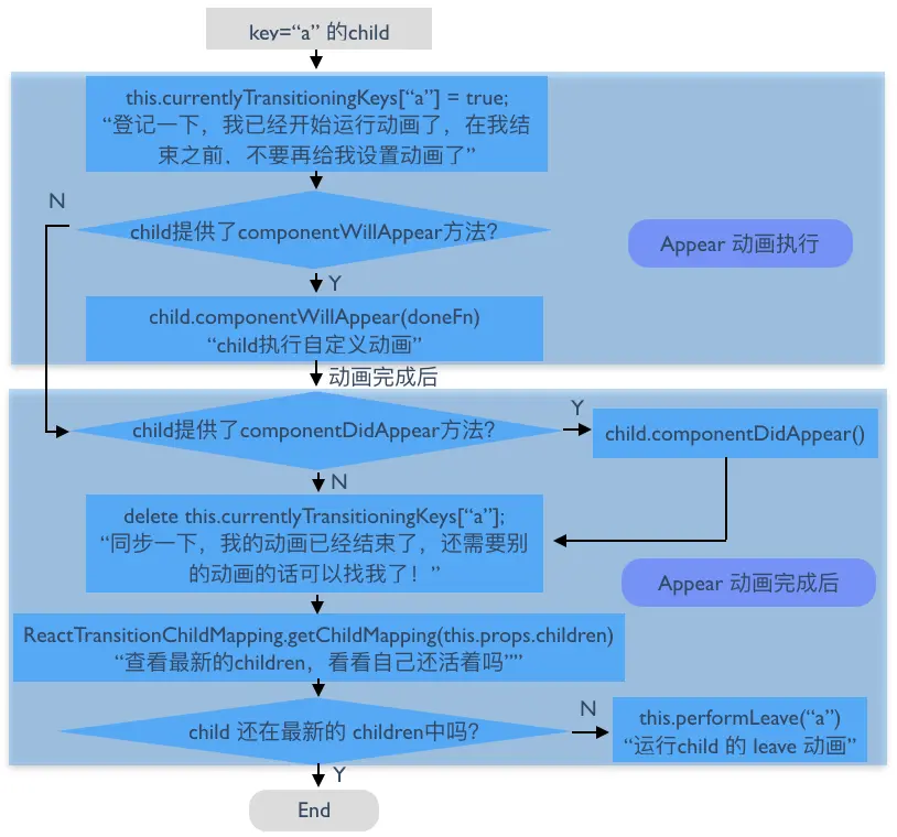 leave 动画稍有不同,看下面源码可以看到,在 leave 动画结束后,如果发现该元素重新 enter,这里会再次执行 enter 动画,否则的话通过更新 state 中的 children 来删除相应的节点。这里也可以回答,为什么对刚 enter 的元素,也要判断该元素是否正在进行动画,因为如果该元素上一次 leave 的动画还没有结束,那么这个节点还一直保留在页面中运行动画。