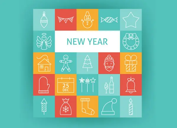 这是一组色彩绚丽的线性图标设计,每个小图标都包含了圣诞和新年主题相关的元素,相互组合在一起细致得如同一款精心制作的海报,相比用来强化设计作品也是相当不错的点缀。