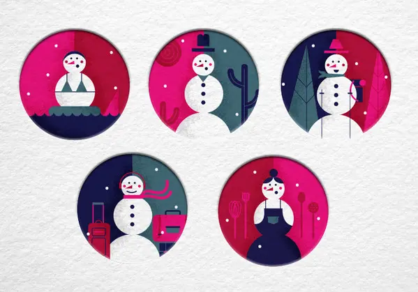 这是一组有趣的图标,五个不同场合不同题材的雪人设计可以说是脑洞大开,突出了季节的特征又各有特色,标杆级创意设计。