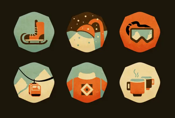 Szende Brassai 的这套冬季图标在视觉上更加独特而复古了,色调的搭配上充满了60年代的风情,沉稳而温暖。这组图标的主题是关于冬天的6种不同的运动。