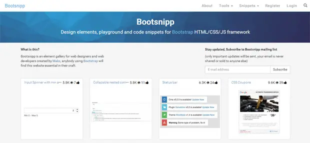 Bootsnipp:在线前端框架交互组件制作工具是一个供给设计师和开发者的基于Bootstrap HTML/CSS/JavaScript 架构的免费元素库。利用Boostrap开发者可以节省大量的时间修复跨浏览器布局问题,实现各种形式的Web界面。